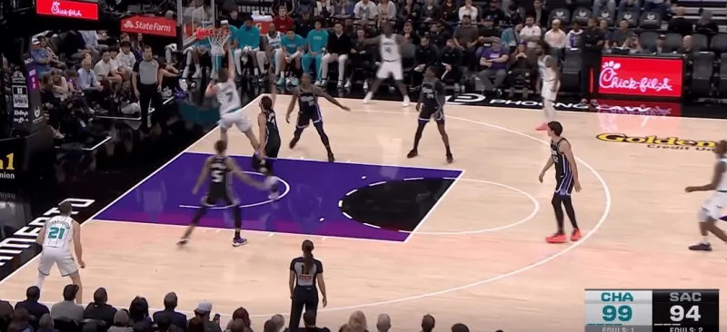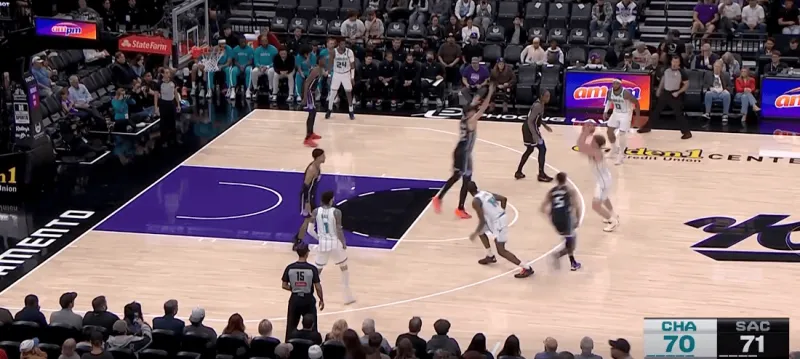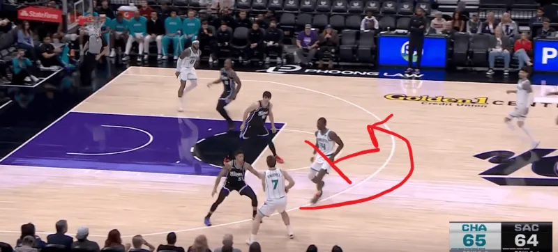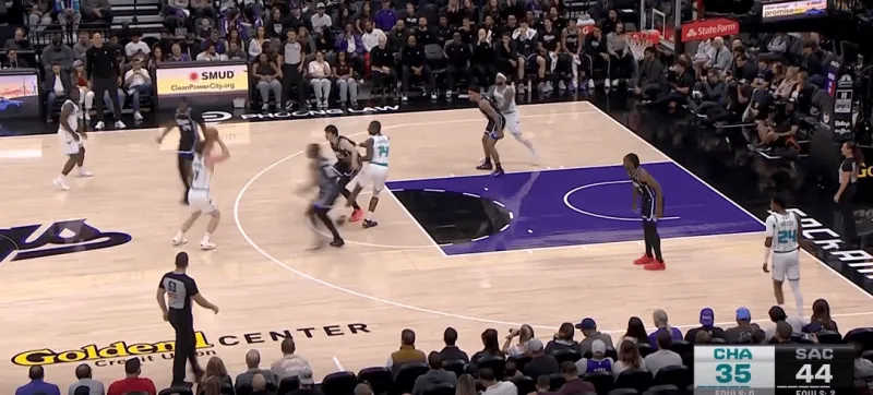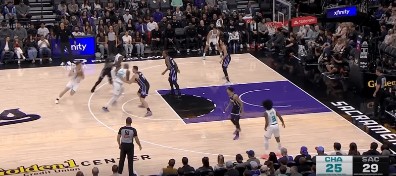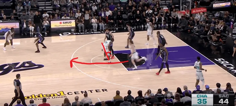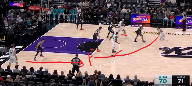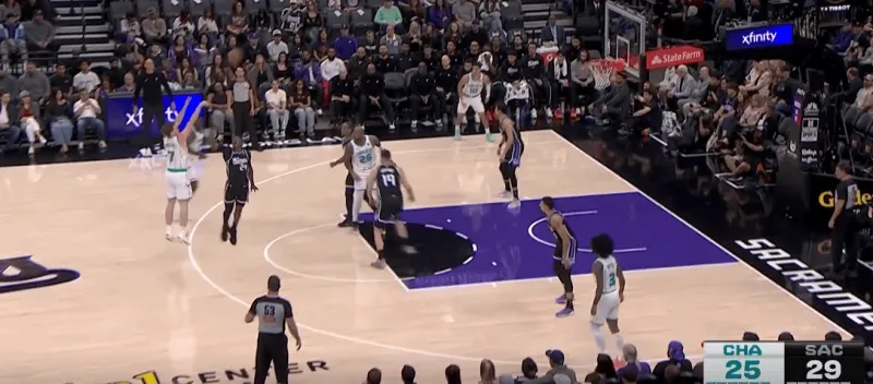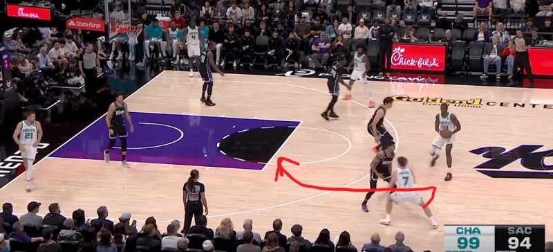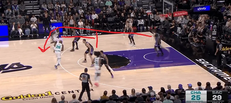 黄蜂阵地战的L系列跑位战术,克尼普尔从底角启动,先借布里奇斯掩护随后从中路走迪亚巴特掩护兜出,本质是gut stagger的起手,克利夫德示意德罗赞提前换防,