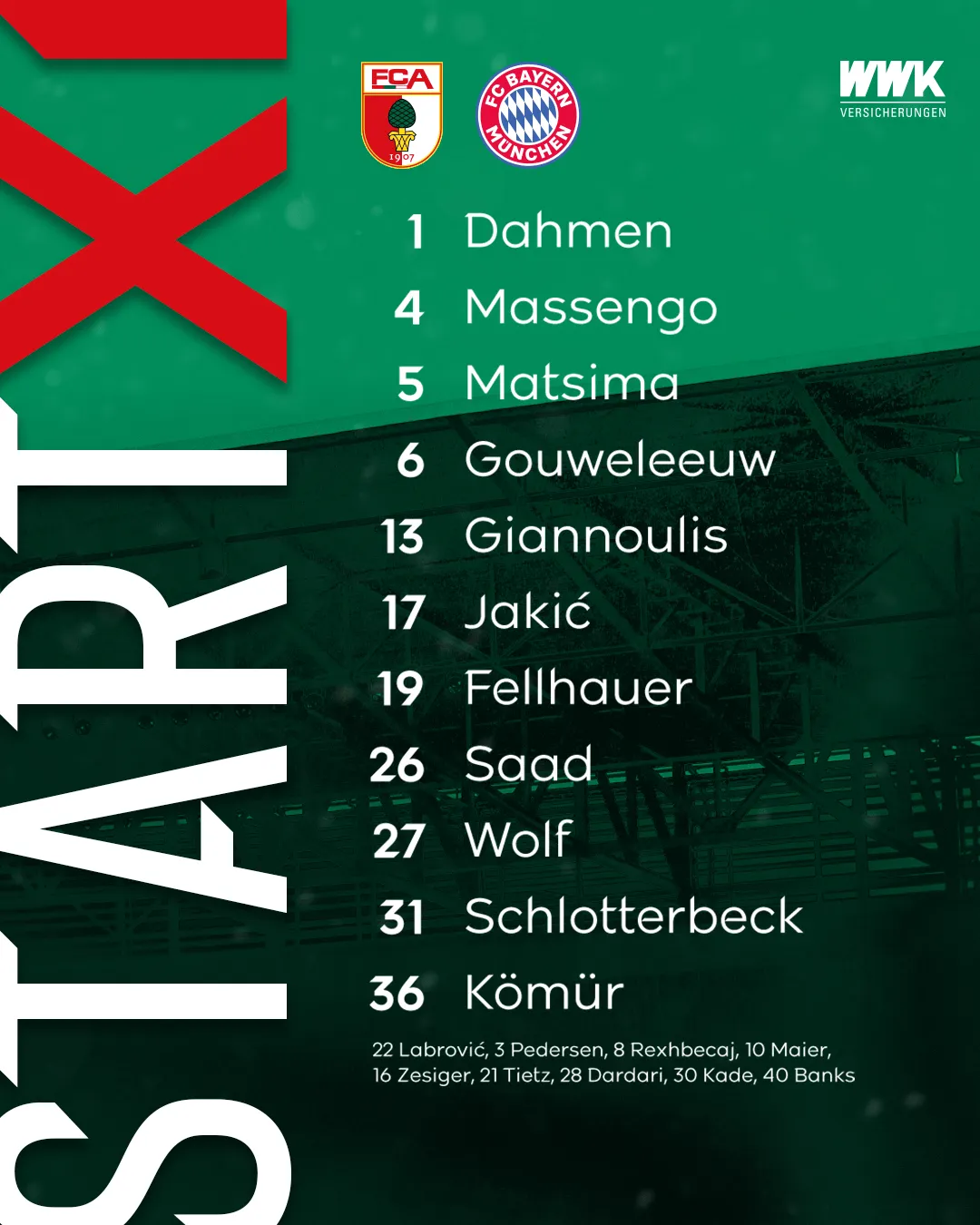 奥格斯堡首发:1-达门、5-马西马、31-凯文-施洛特贝克、6-赫维勒乌、13-吉安努利斯、27-沃尔夫、17-亚基奇、19-罗宾-菲尔豪、4-马森戈、36-科米尔、26-埃利亚斯-萨阿德